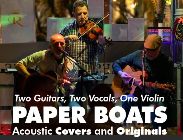Paper Boats are a lively acoustic trio with trademark double-fronted vocals, two guitars and soulful violin. Expect rich harmonies, playful energy and a performance that blends original songs, covers from well known artists and hidden gems from lesser known bands. Join Paper Boats for an evening of heartfelt storytelling with a wink of humour.